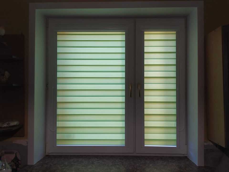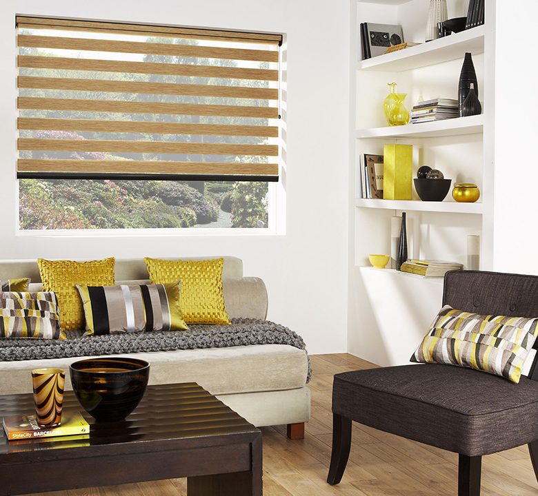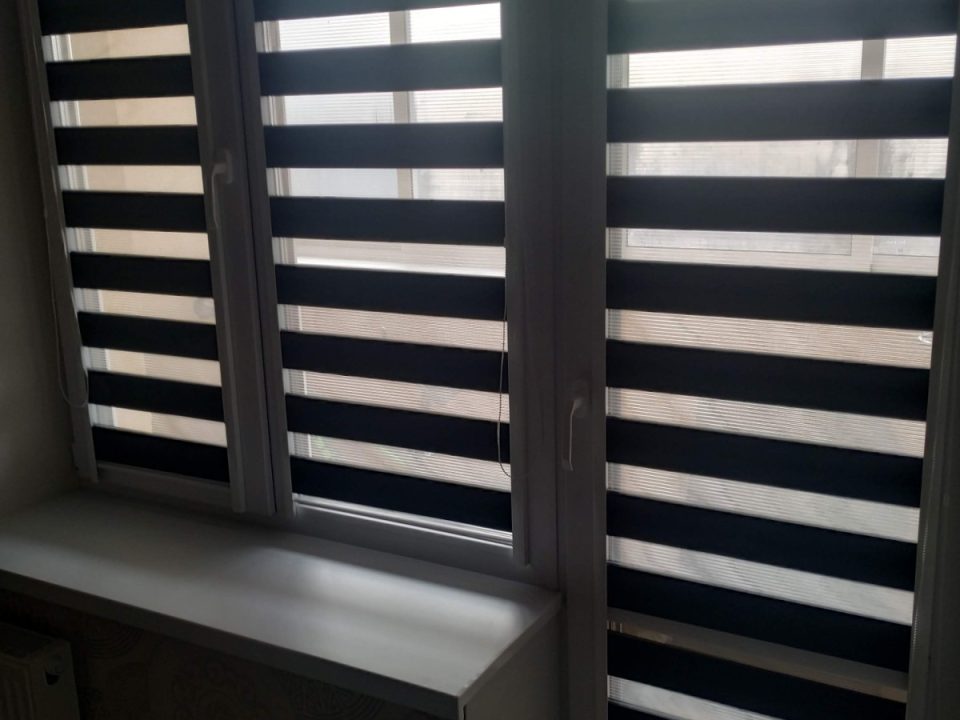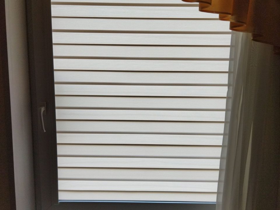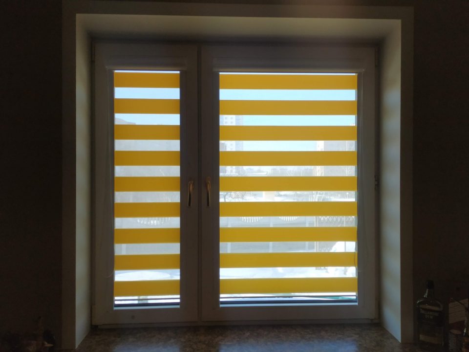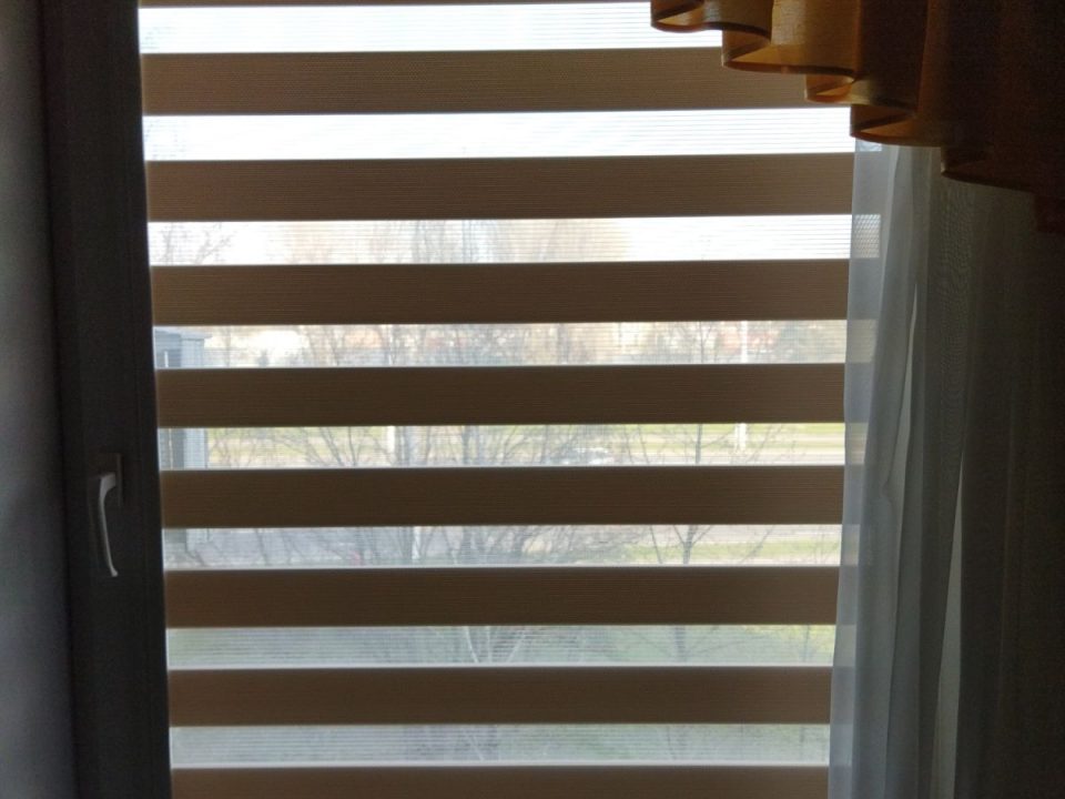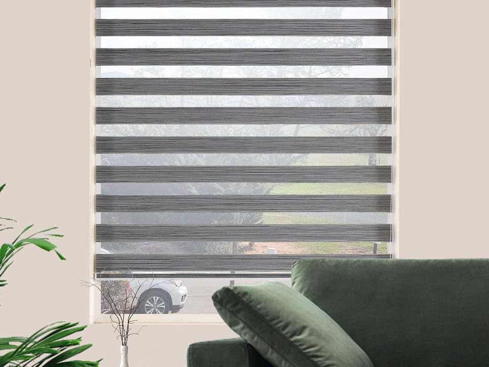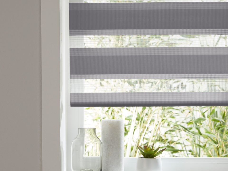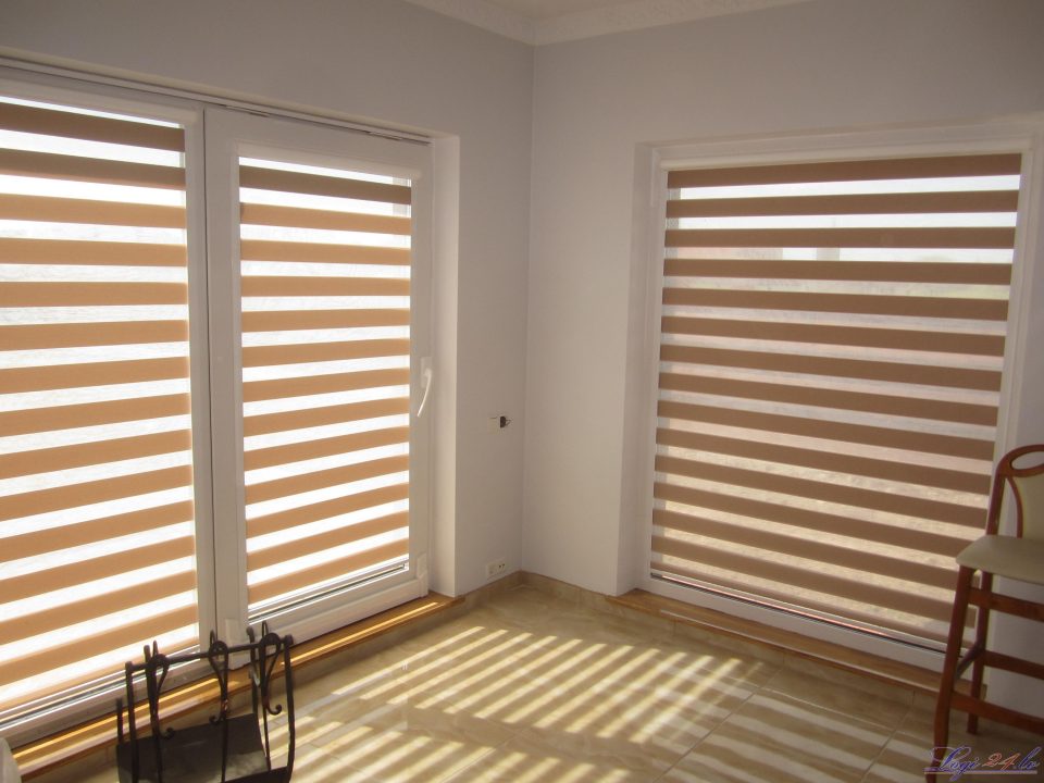 Оригинальная модель рулонных штор – имеет двойное полотно с чередующимися полосами плотной декоративной ткани и прозрачной сетки, позволяет регулировать свет за счет смещения полос ткани