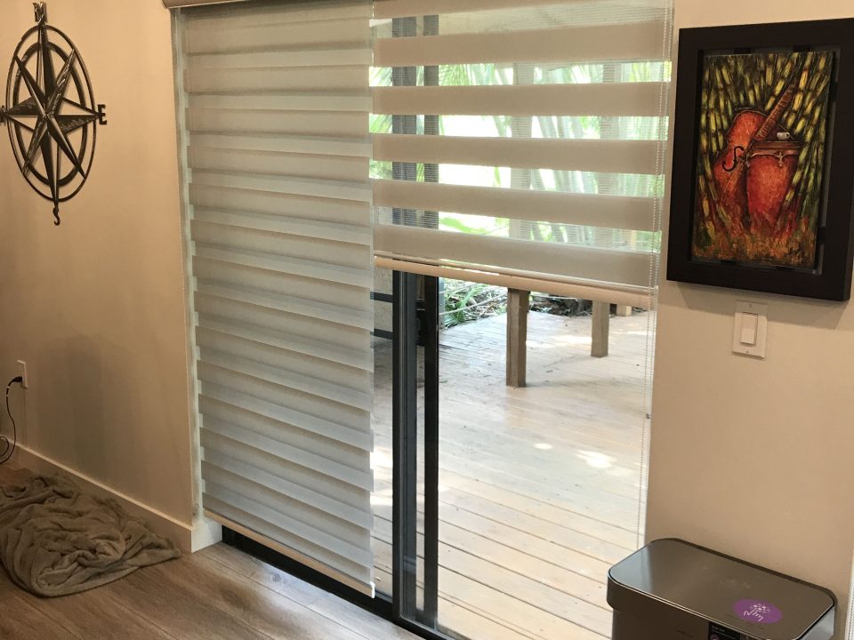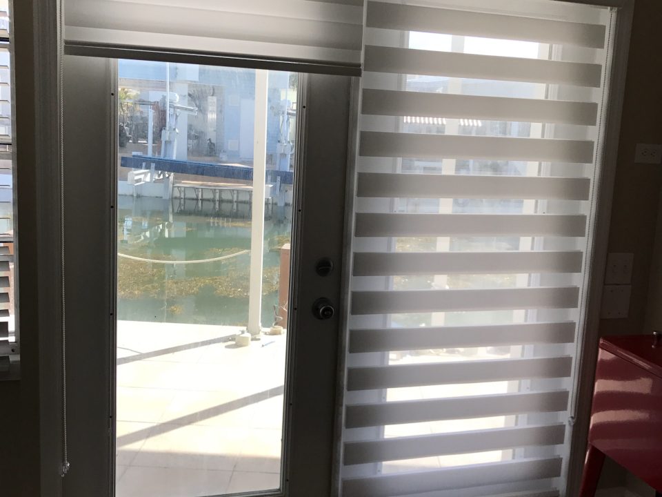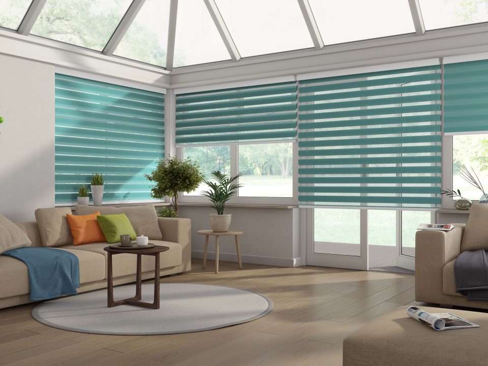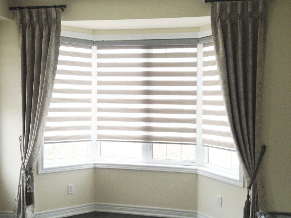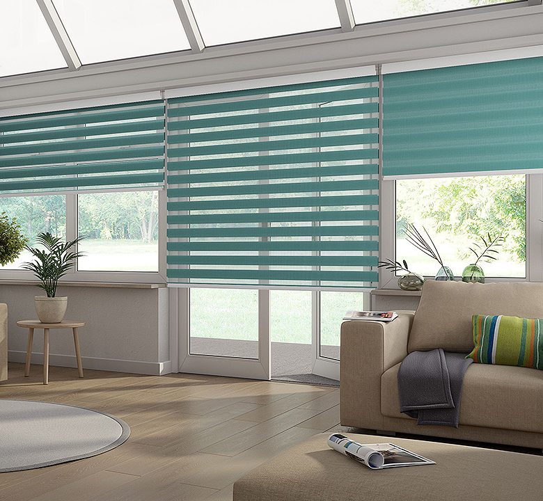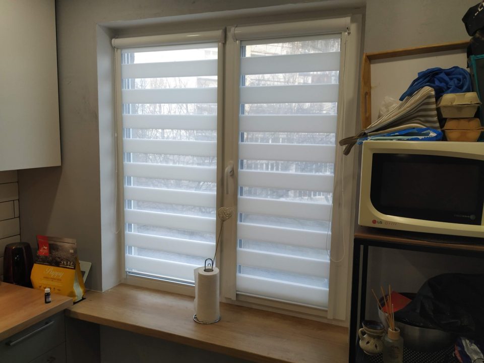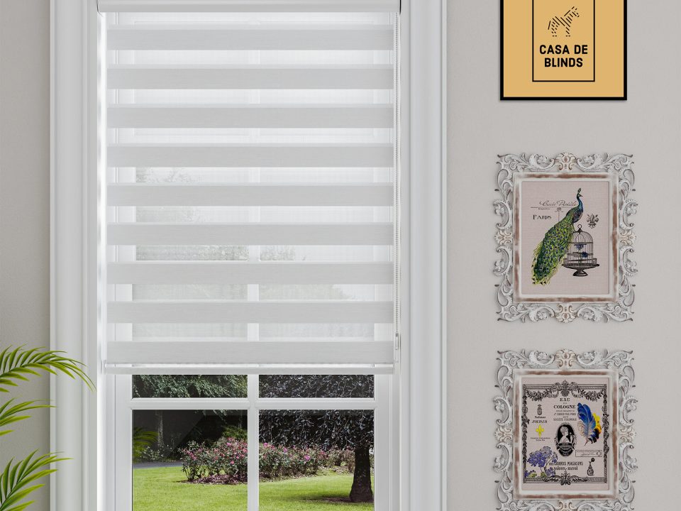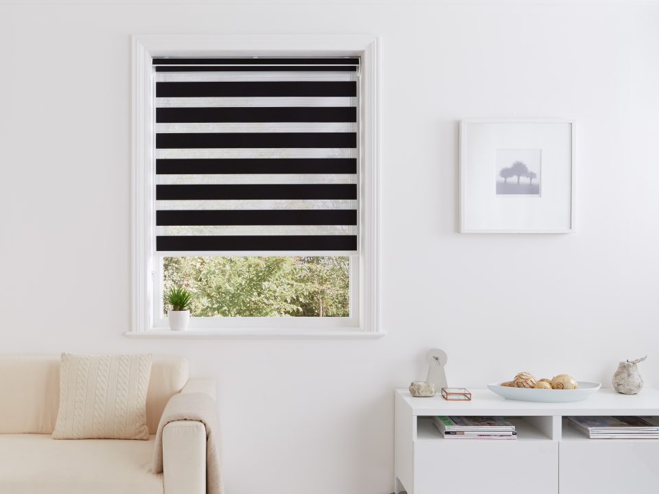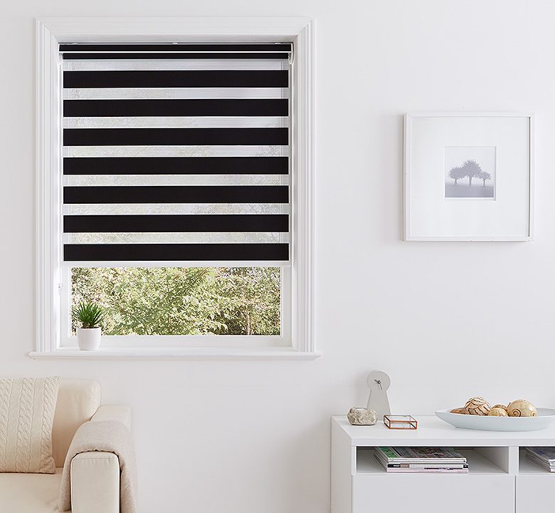 Оригинальная модель рулонных штор – имеет двойное полотно с чередующимися полосами плотной декоративной ткани и прозрачной сетки, позволяет регулировать свет за счет смещения полос ткани