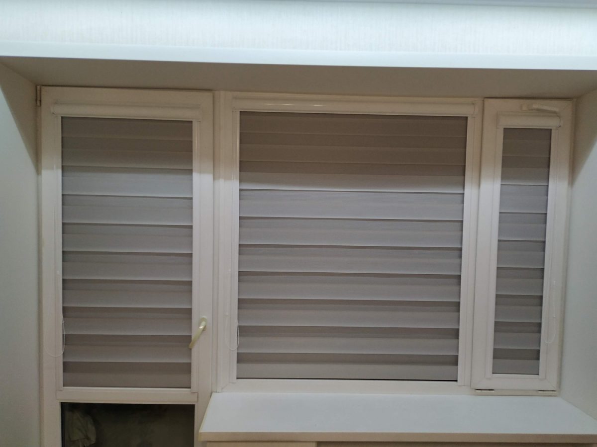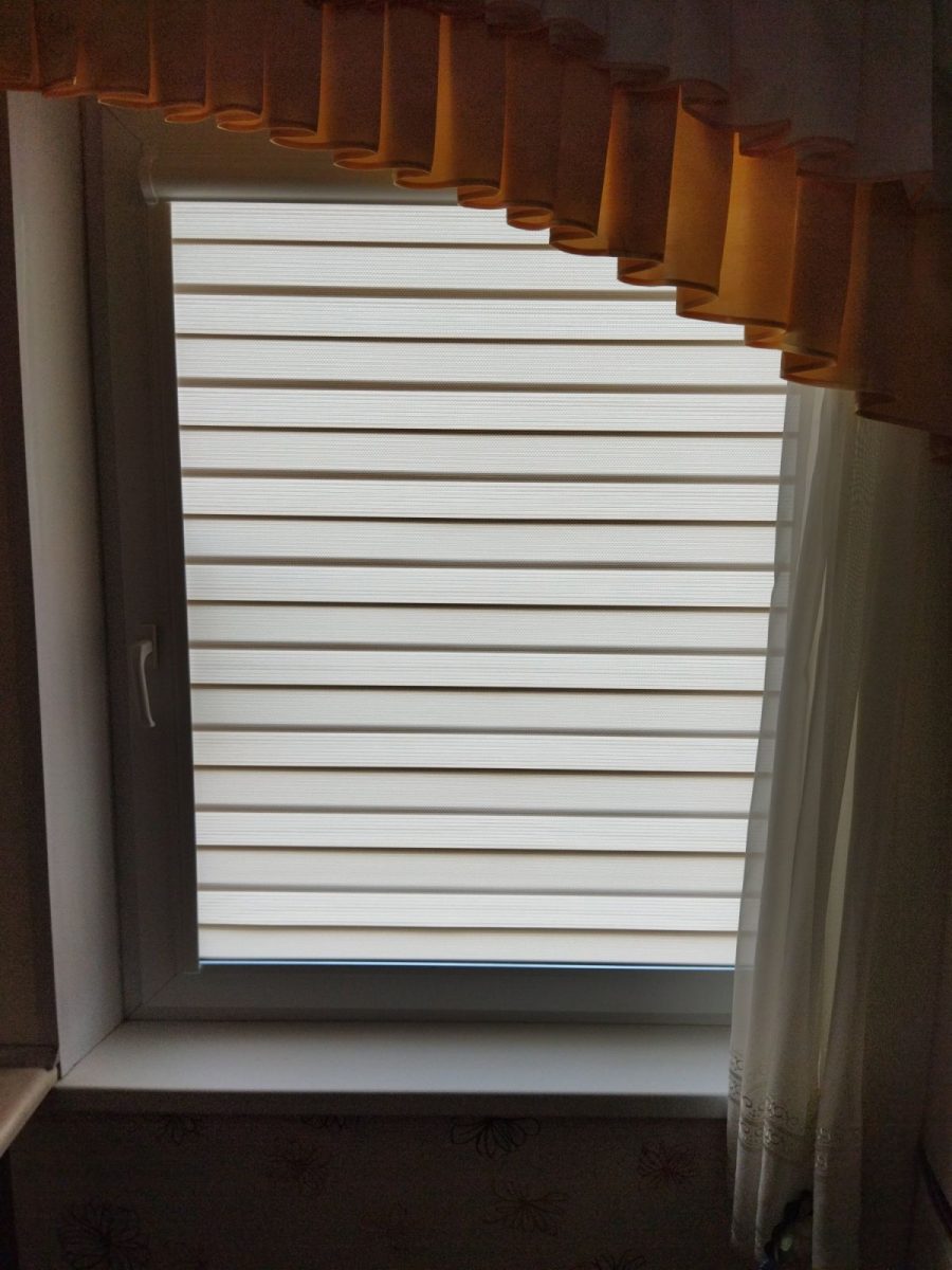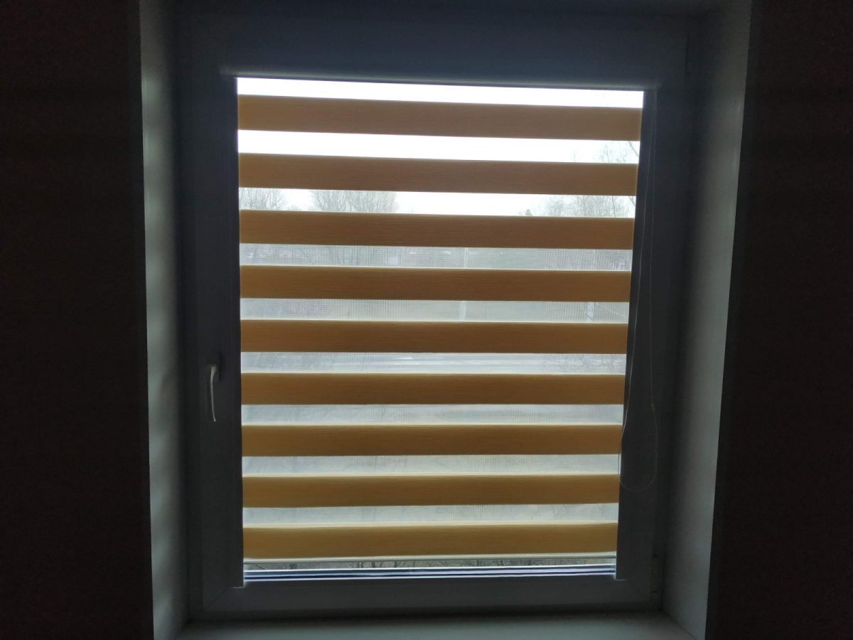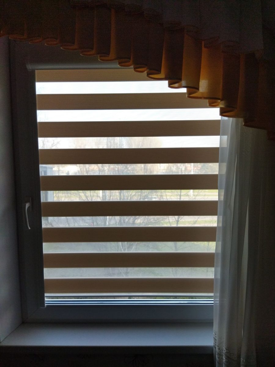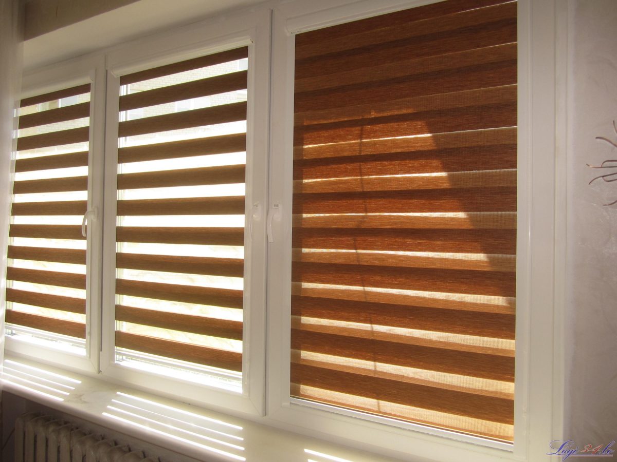 Оригинальная модель рулонных штор – имеет двойное полотно с чередующимися полосами плотной декоративной ткани и прозрачной сетки, позволяет регулировать свет за счет смещения полос ткани