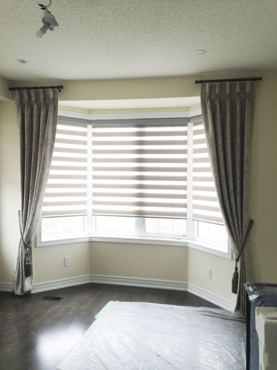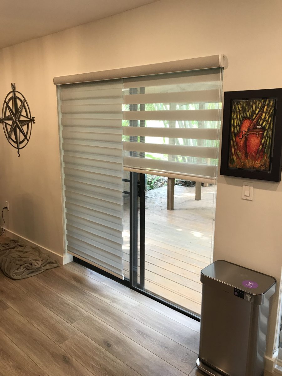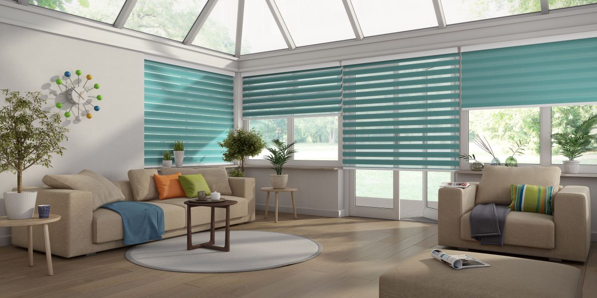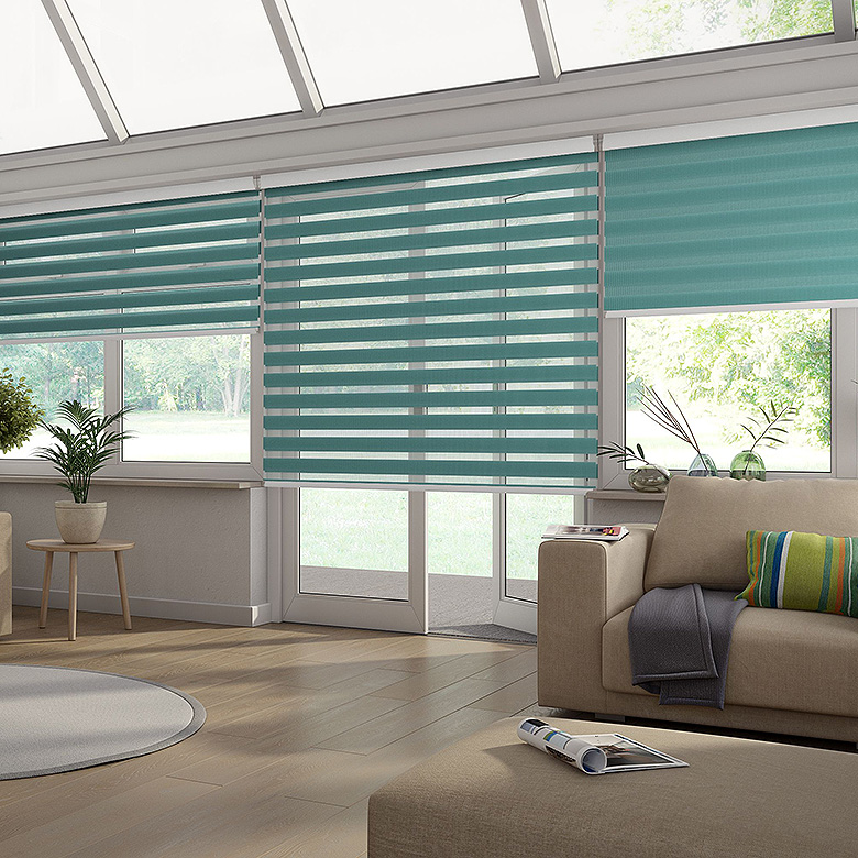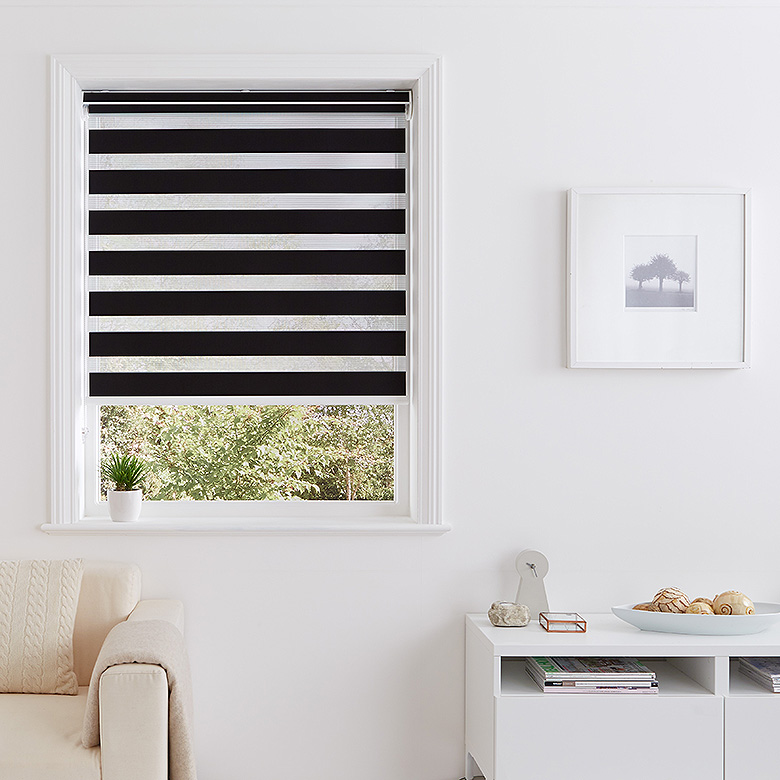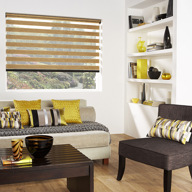 Оригинальная модель рулонных штор – имеет двойное полотно с чередующимися полосами плотной декоративной ткани и прозрачной сетки, позволяет регулировать свет за счет смещения полос ткани